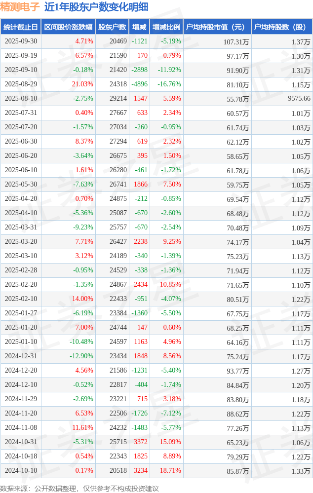 从股价来看,2025年9月19日至2025年9月30日,精测电子区间涨幅为4.71%,在此期间股东户数减少1121.0户,减幅为5.19%。