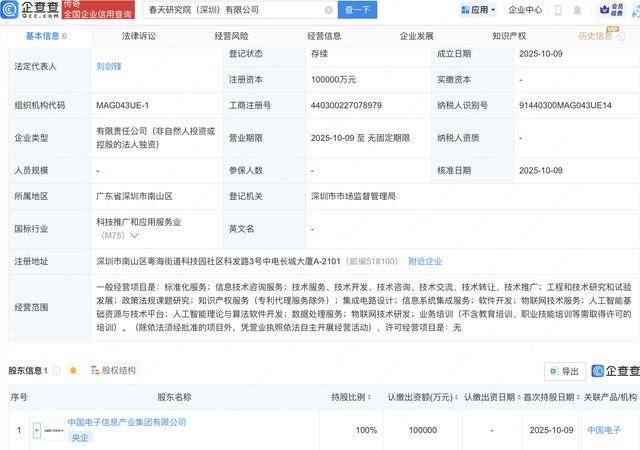 企查查APP显示,近日,春天研究院(深圳)有限公司成立,注册资本10亿元,经营范围包含:集成电路设计;物联网技术服务;人工智能基础资源与技术平台;人工智能理论与算法软件开发等。企查查股权穿透显示,该公司由中国电子信息产业集团有限公司全资持股。