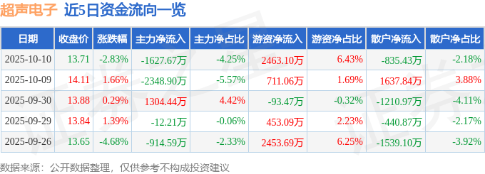 证券之星消息,截至2025年10月10日收盘,超声电子(000823)报收于13.71元,下跌2.83%,换手率5.18%,成交量27.81万手,成交额3.83亿元。