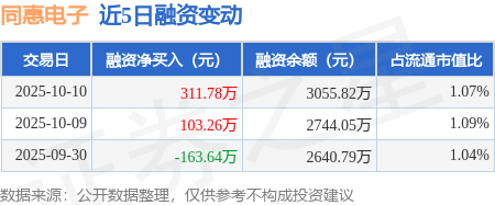 证券之星消息,10月10日,同惠电子(920509)融资买入1817.64万元,融资偿还1505.86万元,融资净买入311.78万元,融资余额3055.82万元。