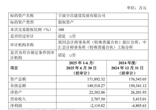 公告显示,宁波宇昌成立于2020年,主营业务包括房屋建筑和市政基础设施项目工程总承包、公路管理与养护等。2024年度、2025年1至6月,该公司分别净亏损4805.63万元、2119.82万元。
