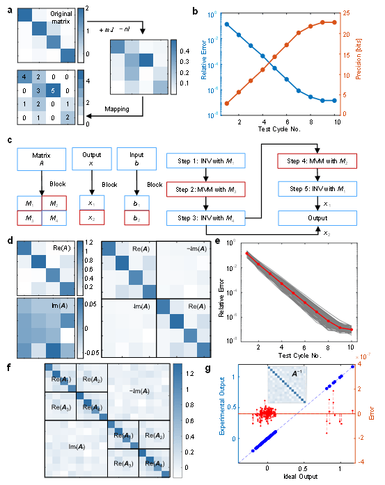 通过与块矩阵算法相结合,我们在实验上成功实现了 16×16 矩阵的 24 比特定点数精度求逆(图 3)。具体而言,矩阵方程求解经过 10 次迭代后,相对误差可低至 10⁻⁷量级,展现了该方案在计算精度上的显著优势。