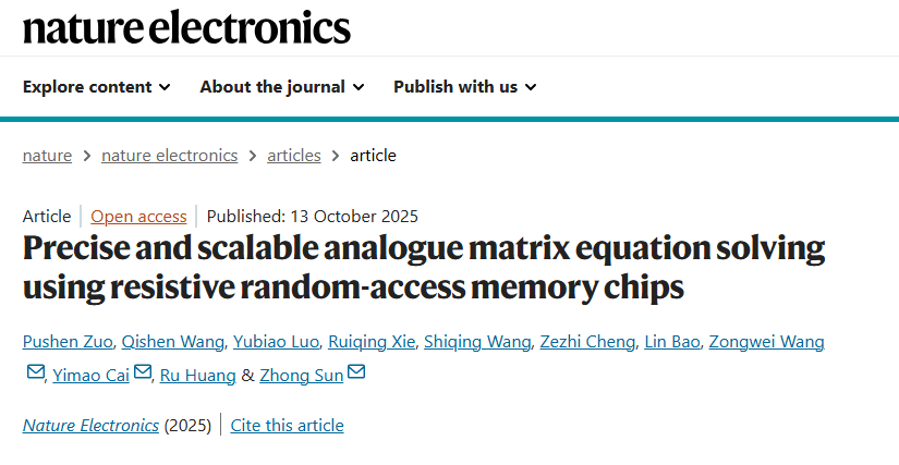 10 月 14 日消息,据北京大学人工智能研究院官方微信公众号消息,昨日,北京大学人工智能研究院孙仲研究员团队及合作者在国际学术期刊《自然・电子学》(Nature Electronics)杂志发表了题为 Precise and scalable analogue matrix equation solving using resistive random-access memory chips 的论文,在新型计算架构上取得重大突破。