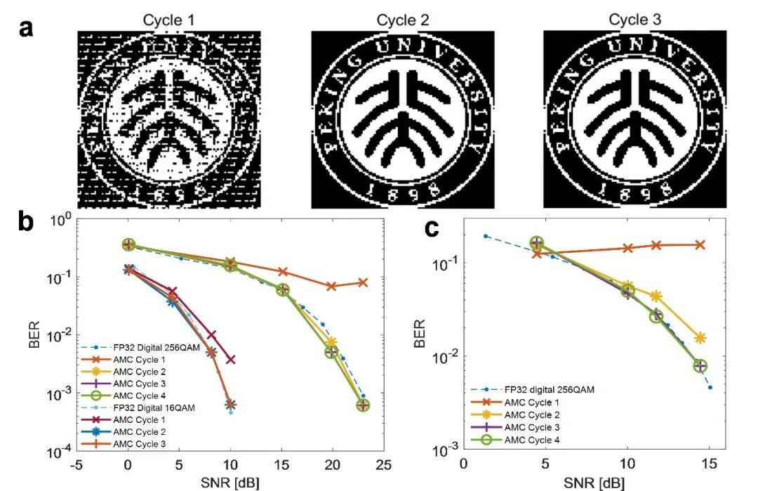在应用验证层面,该方法被成功应用于大规模多输入多输出(MIMO)系统的信号检测任务。研究团队展示了基于迫零检测的图像恢复效果,在第二个迭代周期内,接收图像即与原始图像达到高度一致。进一步的误码率-信噪比分析显示,仅需三次迭代,该系统在无线通信场景下的检测性能即可媲美 32 位浮点精度数字处理器(图 4),凸显出其在实时信号处理中的潜力。