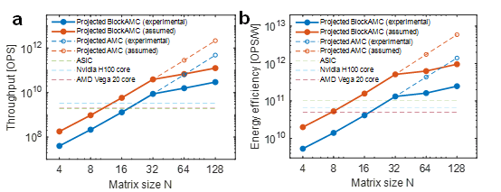 在计算性能方面,该技术表现出卓越的加速能力与能效。测试结果表明,在求解 32×32 矩阵求逆问题时,其算力已超越高端 GPU 的单核性能;当问题规模扩大至 128×128 时,计算吞吐量更达到顶级数字处理器的 1000 倍以上。同时,该方案在能效方面亦表现突出,在相同精度下能效比传统数字处理器提升超 100 倍,为高能效计算中心提供了关键技术支撑。