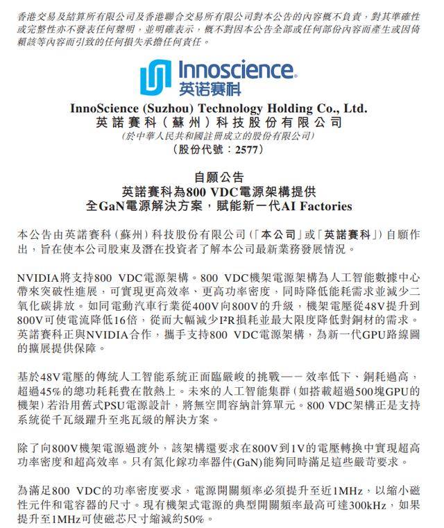 10月14日,英诺赛科(02577.HK)在港交所公告,公司为800 VDC电源架构提供全GaN电源解决方案,赋能新一代AI Factories。NVIDIA将支持800 VDC电源架构。800 VDC机架电源架构为人工智能数据中心带来突破性进展,可实现更高效率、更高功率密度,同时降低能耗需求并减少二氧化碳排放。