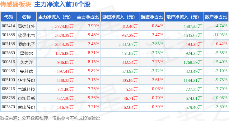 从资金流向上来看,当日传感器板块主力资金净流出88.88亿元,游资资金净流入30.51亿元,散户资金净流入58.37亿元。传感器板块个股资金流向见下表: