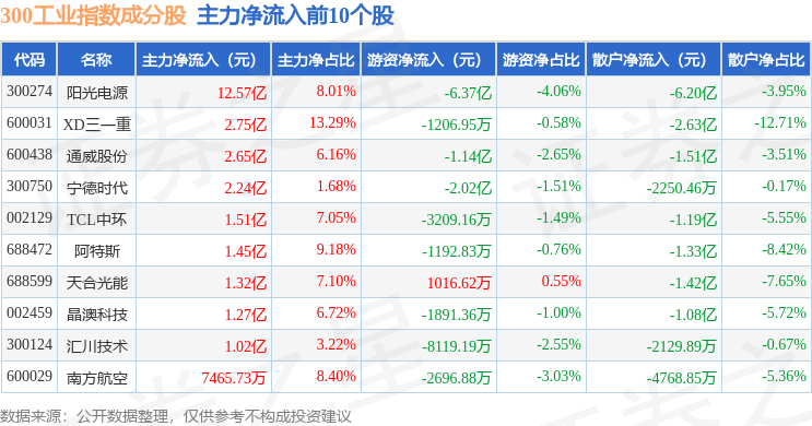资金流向方面,300工业(000910)指数成份股当日主力资金净流入合计7.86亿元,游资资金净流出合计4.57亿元,散户资金净流出合计3.29亿元。成份股资金流向详情见下表:
