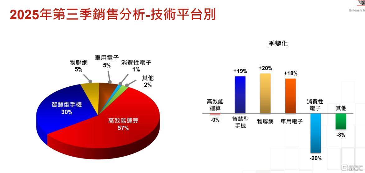 从平台收入分布看,HPC(高性能计算)占比57%,首次明显超过智能手机的30%。这反映了AI芯片需求的持续火热。