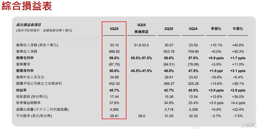 台积电2025年第三季毛利率为59.5% ,营业利益率为50.6% ,税后纯益率则为45.7% 。