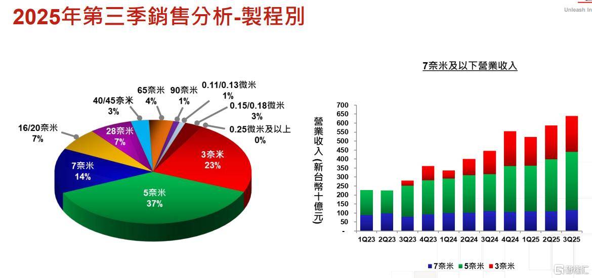 其中,3纳米制程出货占台积公司2025年第三季晶圆销售金额的23%,5纳米制程出货占全季晶圆销售金额的37%;7纳米制程出货则占全季晶圆销售金额的14%。总体而言,先进制程(包含7奈米及更先进制程)的营收达到全季晶圆销售金额的74% 。