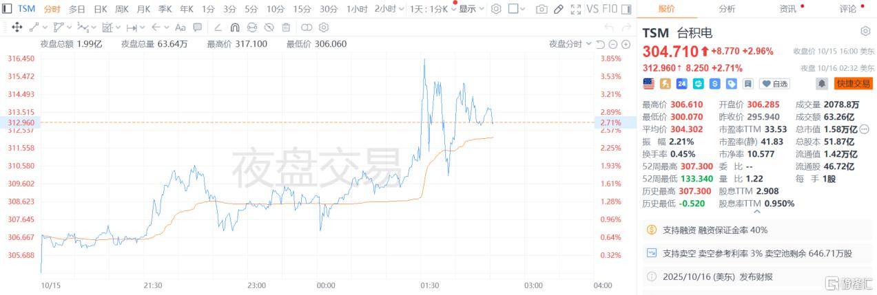 受此影响,台积电美股夜盘拉升涨近3%,报312.96美元。