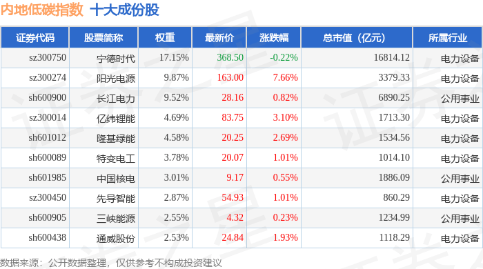 内地低碳(000977)指数十大成份股详情如下: