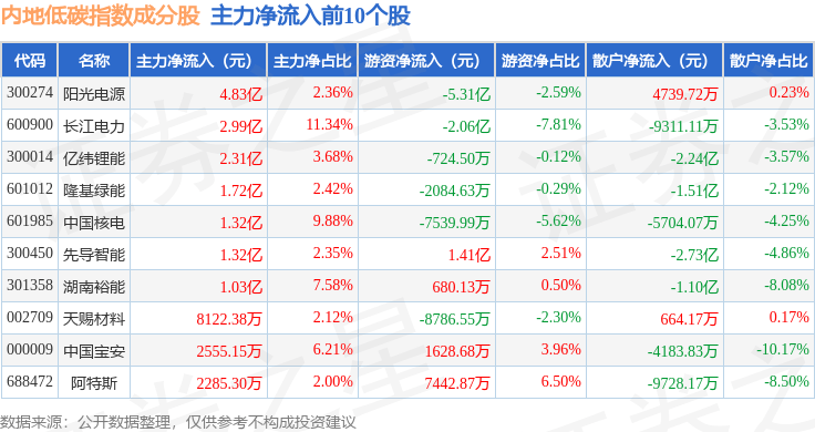 资金流向方面,内地低碳(000977)指数成份股当日主力资金净流出合计11.54亿元,游资资金净流入合计3.87亿元,散户资金净流入合计7.67亿元。成份股资金流向详情见下表: