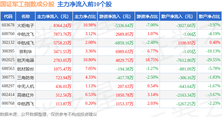 资金流向方面,国证军工(399368)指数成份股当日主力资金净流出合计21.54亿元,游资资金净流入合计7.75亿元,散户资金净流入合计13.79亿元。成份股资金流向详情见下表: