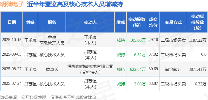 明微电子近半年内的董监高及核心技术人员增减持详情如下: