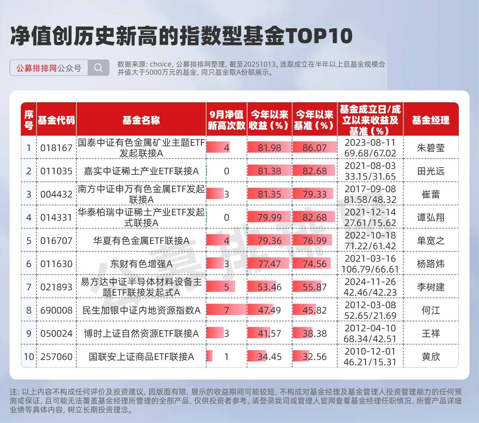 从上榜的基金来看,有色金属、稀土及资源股的行业指数基金占据大半江山,其中,国泰中证有色金属矿业主题ETF发起联接A、嘉实中证稀土产业ETF联接A和南方中证申万有色金属ETF发起联接A今年以来收益均超81%。而在主动权益类基金中表现较好的半导体主题,在指数基金中表现相对较弱。