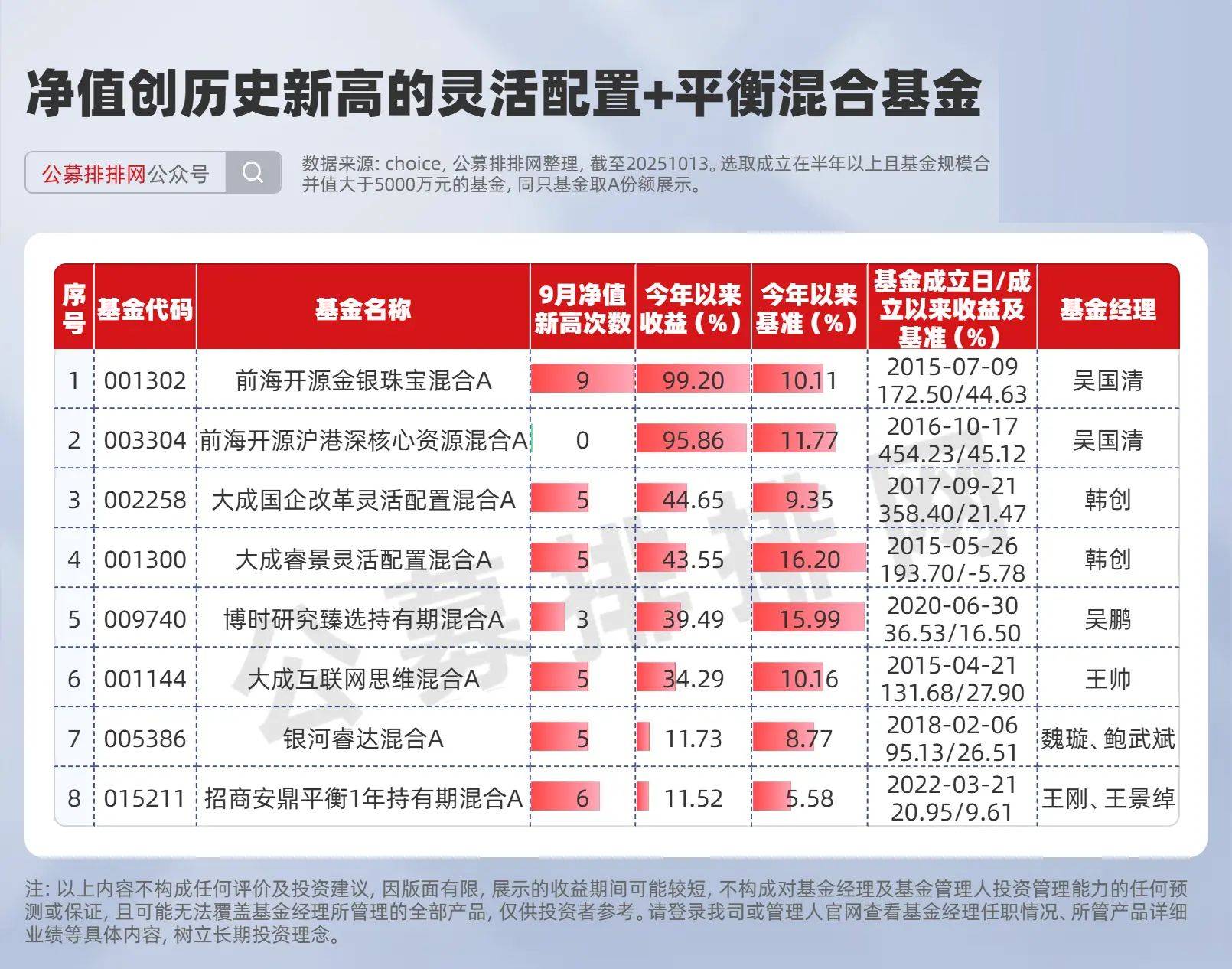 从灵活配置和平衡混合基金来看,剔除成立不足半年的基金,截至10月13日,共有1388只普通股票型基金,净值仍在创历史新高的基金仅8只,占比0.58%。
