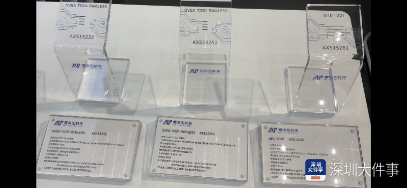 记者在现场看到,爱协生科技展示了其最新的TDDI(触控与显示驱动集成)芯片系列产品。多个芯片样品陈列于亚克力展架上,背景蚀刻的电路图样彰显了产品的科技感。每款芯片下方均配有详细的技术参数铭牌,清晰标注了其所支持的分辨率、接口类型、核心特性以及在消费电子、智能穿戴、智能家电、工业控制等领域的具体应用场景,直观地呈现了该公司在人机交互显示芯片领域的专业实力与产品布局。