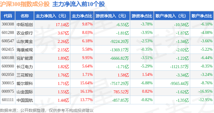 资金流向方面,沪深300(399300)指数成份股当日主力资金净流出合计451.4亿元,游资资金净流入合计140.62亿元,散户资金净流入合计310.78亿元。成份股资金流向详情见下表:
