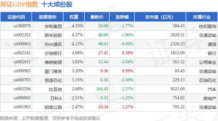 证券之星消息,10月17日,深证GDP(399648)指数报收于11570.96点,跌2.02%,成交1761.74亿元,换手率2.12%。当日该指数成份股中,上涨的有9家,厦门港务以9.99%的涨幅领涨,下跌的有91家,阳光电源以10.91%的跌幅领跌。