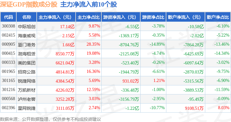资金流向方面,深证GDP(399648)指数成份股当日主力资金净流出合计156.63亿元,游资资金净流入合计43.34亿元,散户资金净流入合计113.29亿元。成份股资金流向详情见下表: