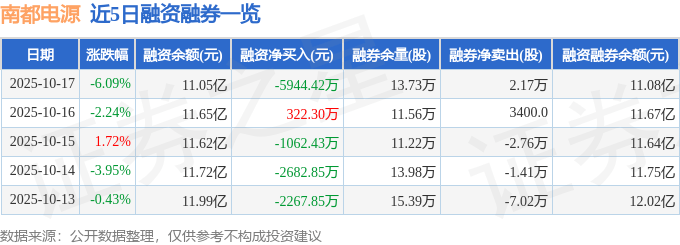 证券之星消息,截至2025年10月17日收盘,南都电源(300068)报收于16.81元,下跌6.09%,换手率5.47%,成交量46.63万手,成交额8.05亿元。