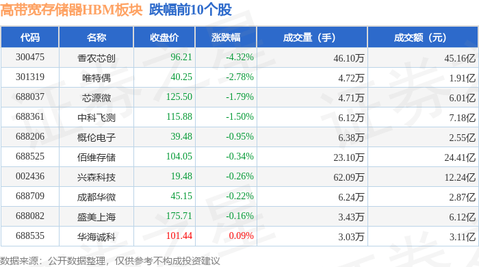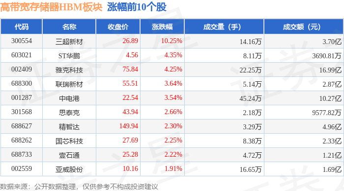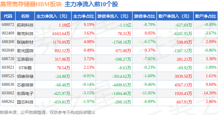 从资金流向上来看,当日高带宽存储器HBM板块主力资金净流出9.26亿元,游资资金净流出1.63亿元,散户资金净流入10.89亿元。高带宽存储器HBM板块个股资金流向见下表: