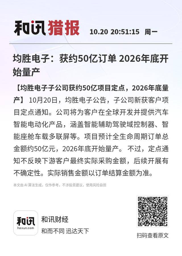 【均胜电子子公司获约50亿项目定点,2026年底量产】10月20日,均胜电子公告,子公司新获客户项目定点通知。公司将为客户在全球开发并提供汽车智能电动化产品,涵盖智能辅助驾驶域控制器、智能座舱车载多联屏等。项目预计全生命周期订单总金额约50亿元,2026年底开始量产。 不过,定点通知不反映下游客户最终实际采购金额,后续开展有不确定性。实际销售金额以订单结算金额为准。