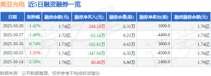美亚光电融资融券信息显示,融资方面,当日融资买入1058.84万元,融资偿还814.6万元,融资净买入244.24万元。融券方面,融券卖出1500.0股,融券偿还500.0股,融券余量6.31万股,融券余额122.79万元。融资融券余额1.76亿元。