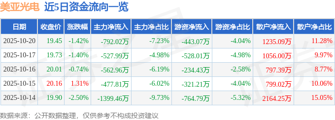 10月20日的资金流向数据方面,主力资金净流出792.02万元,占总成交额7.23%,游资资金净流出443.07万元,占总成交额4.04%,散户资金净流入1235.09万元,占总成交额11.28%。