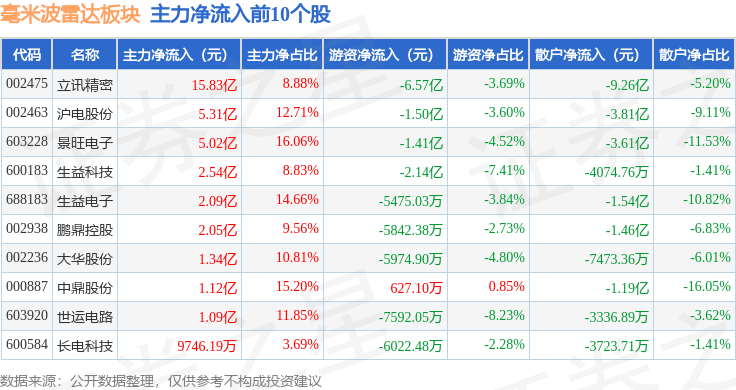从资金流向上来看,当日毫米波雷达板块主力资金净流入39.66亿元,游资资金净流出21.01亿元,散户资金净流出18.65亿元。毫米波雷达板块个股资金流向见下表: