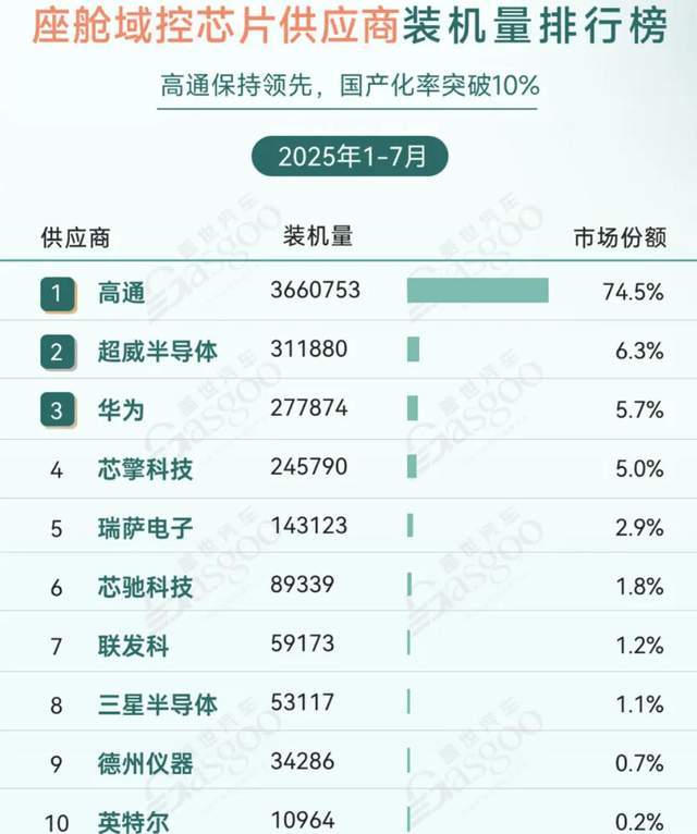 其中高通的芯片使用量高达3660753 颗,占比高达74.5%,高居国内整个座舱芯片的榜首,并且是断崖式的领先。