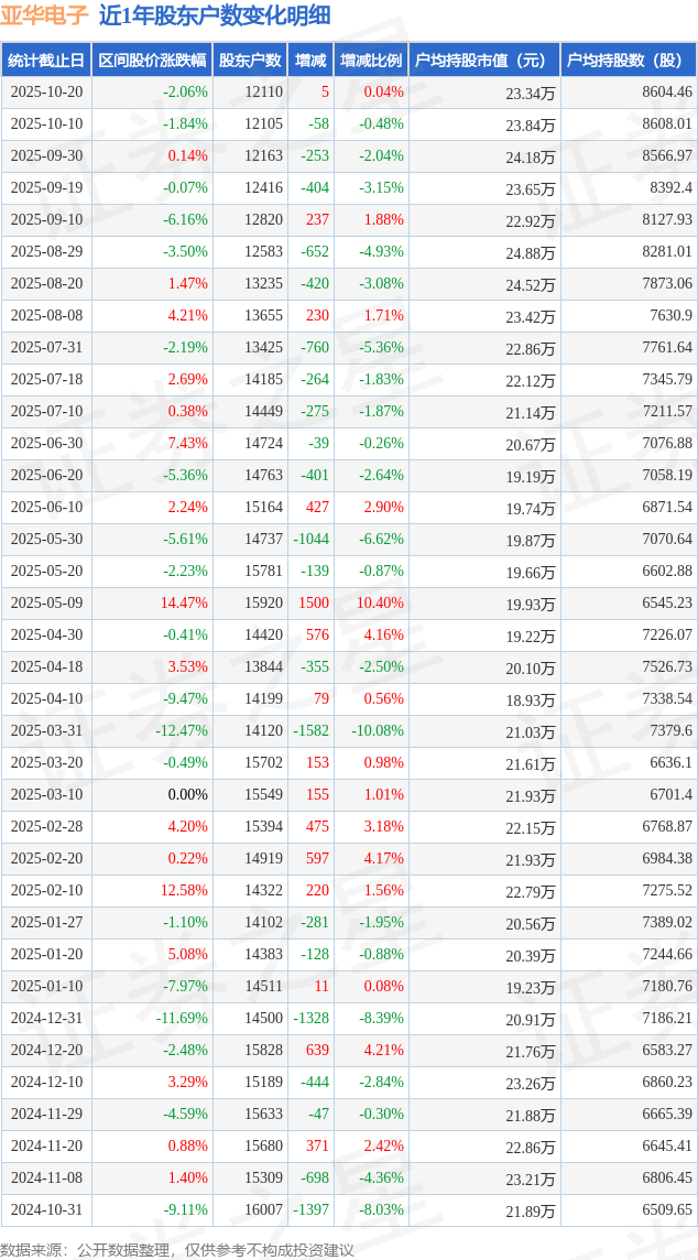 从股价来看,2025年10月10日至2025年10月20日,亚华电子区间跌幅为2.06%,在此期间股东户数增加5.0户,增幅为0.04%。