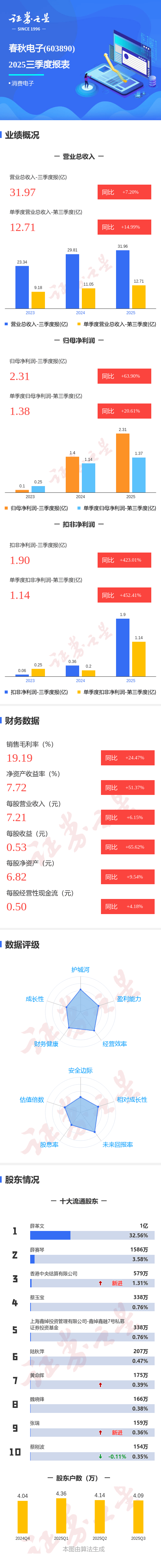证券之星消息,春秋电子2025年三季报显示,前三季度公司主营收入31.97亿元,同比上升7.21%;归母净利润2.31亿元,同比上升63.91%;扣非净利润1.9亿元,同比上升423.01%;其中2025年第三季度,公司单季度主营收入12.71亿元,同比上升15.0%;单季度归母净利润1.38亿元,同比上升20.61%;单季度扣非净利润1.14亿元,同比上升452.42%;负债率49.72%,投资收益1649.92万元,财务费用7243.29万元,毛利率19.19%。