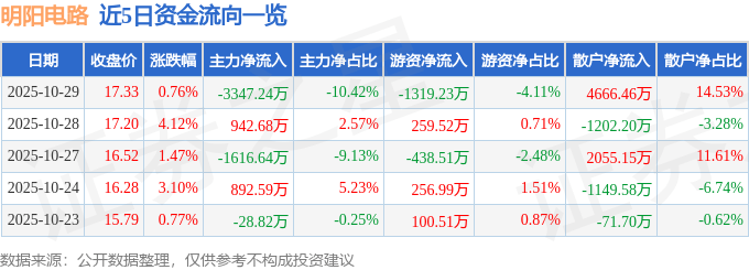 证券之星消息,截至2025年10月29日收盘,明阳电路(300739)报收于17.33元,上涨0.76%,换手率5.61%,成交量18.54万手,成交额3.21亿元。