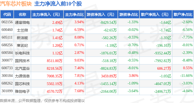 从资金流向上来看,当日汽车芯片板块主力资金净流出42.71亿元,游资资金净流入21.31亿元,散户资金净流入21.4亿元。汽车芯片板块个股资金流向见下表: