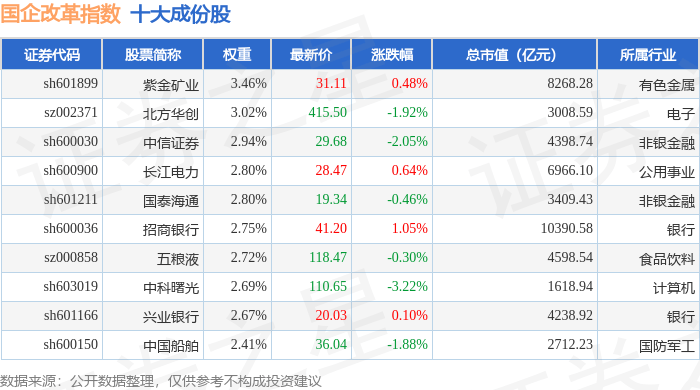 国企改革(399974)指数十大成份股详情如下: