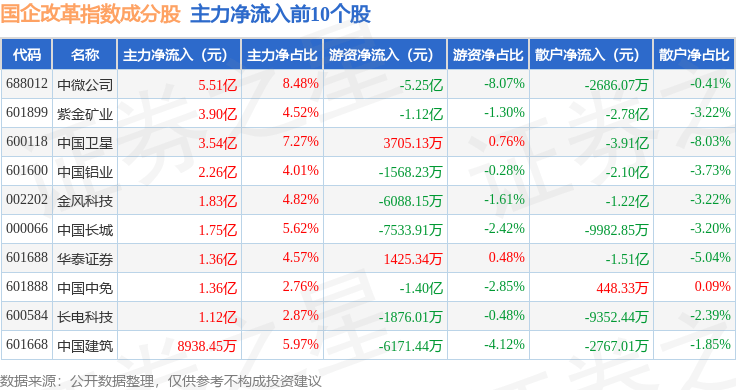 资金流向方面,国企改革(399974)指数成份股当日主力资金净流出合计64.5亿元,游资资金净流入合计23.54亿元,散户资金净流入合计40.96亿元。成份股资金流向详情见下表: