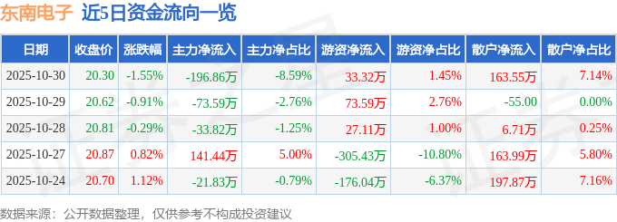 证券之星消息,截至2025年10月30日收盘,东南电子(301359)报收于20.3元,下跌1.55%,换手率3.13%,成交量1.12万手,成交额2291.92万元。
