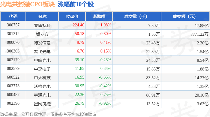 证券之星消息,10月31日光电共封装CPO板块较上一交易日下跌5.65%,德科立领跌。当日上证指数报收于3954.79,下跌0.81%。深证成指报收于13378.21,下跌1.14%。光电共封装CPO板块个股涨跌见下表: