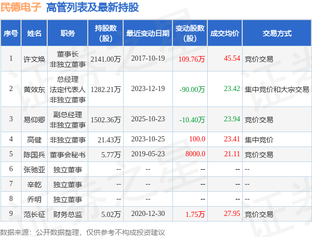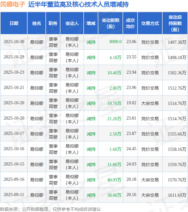 民德电子近半年内的董监高及核心技术人员增减持详情如下: