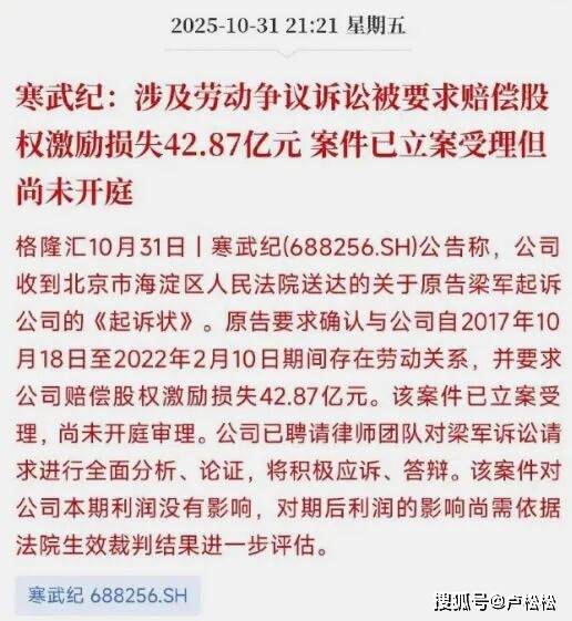 寒武纪的前CTO梁军,要告寒武纪了,要赔他42.87亿!注意,是“亿”,不是“万”哦!金额大得离谱,这个案件已经正式立案。这是一起典型的“核心人才股权激励纠纷”案例。