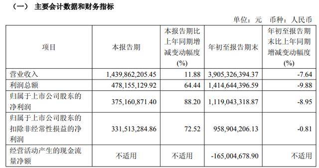 其中,公司第三季度业绩同比有明显改观,当季营业收入为14.4亿元,同比上升11.88%;归母净利润为3.75亿元,同比上升88.20%;扣非归母净利润为3.32亿元,同比上升72.52%。