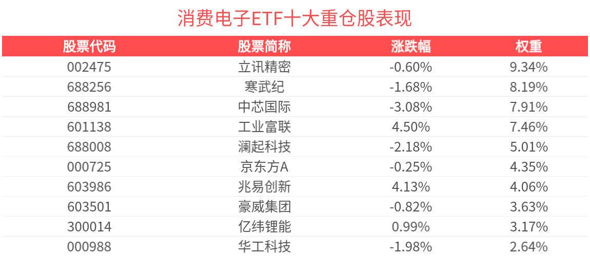 数据显示,截至2025年10月31日,中证消费电子主题指数(931494)前十大权重股分别为立讯精密(002475)、寒武纪(688256)、工业富联(601138)、中芯国际(688981)、澜起科技(688008)、京东方A(000725)、兆易创新(603986)、豪威集团(603501)、亿纬锂能(300014)、东山精密(002384),前十大权重股合计占比56.3%。