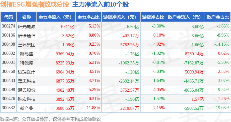 资金流向方面,创指ESG增强(970034)指数成份股当日主力资金净流出合计8.81亿元,游资资金净流入合计2.44亿元,散户资金净流入合计6.38亿元。成份股资金流向详情见下表:
