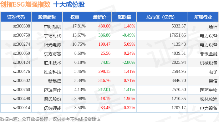 证券之星消息,11月3日,创指ESG增强(970034)指数报收于3000.42点,涨0.61%,成交1249.03亿元,换手率2.0%。当日该指数成份股中,上涨的有22家,阳光电源以5.09%的涨幅领涨,下跌的有18家,新宙邦以4.14%的跌幅领跌。
