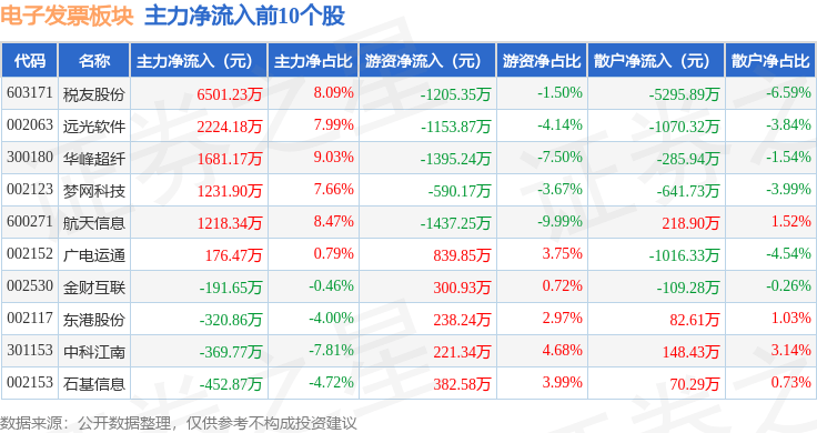 从资金流向上来看,当日电子发票板块主力资金净流出2.26亿元,游资资金净流入4848.34万元,散户资金净流入1.78亿元。电子发票板块个股资金流向见下表: