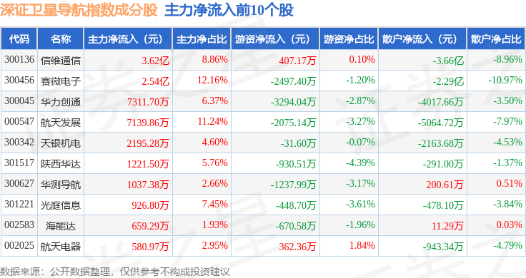 资金流向方面,深证卫星导航(970050)指数成份股当日主力资金净流入合计3.33亿元,游资资金净流入合计1.3亿元,散户资金净流出合计4.63亿元。成份股资金流向详情见下表: