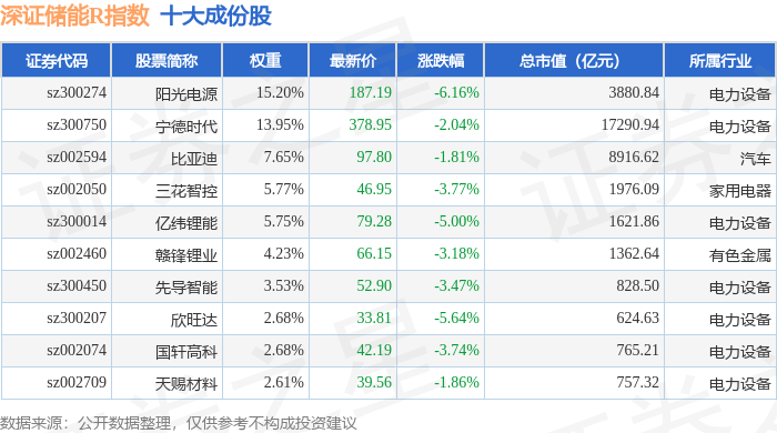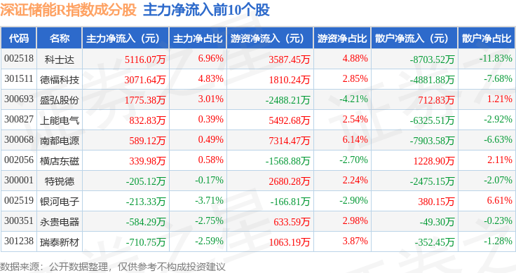 资金流向方面,深证储能R(470036)指数成份股当日主力资金净流出合计117.77亿元,游资资金净流入合计25.55亿元,散户资金净流入合计92.22亿元。成份股资金流向详情见下表:
